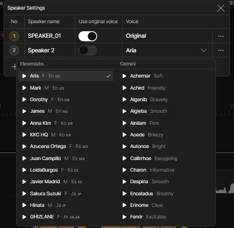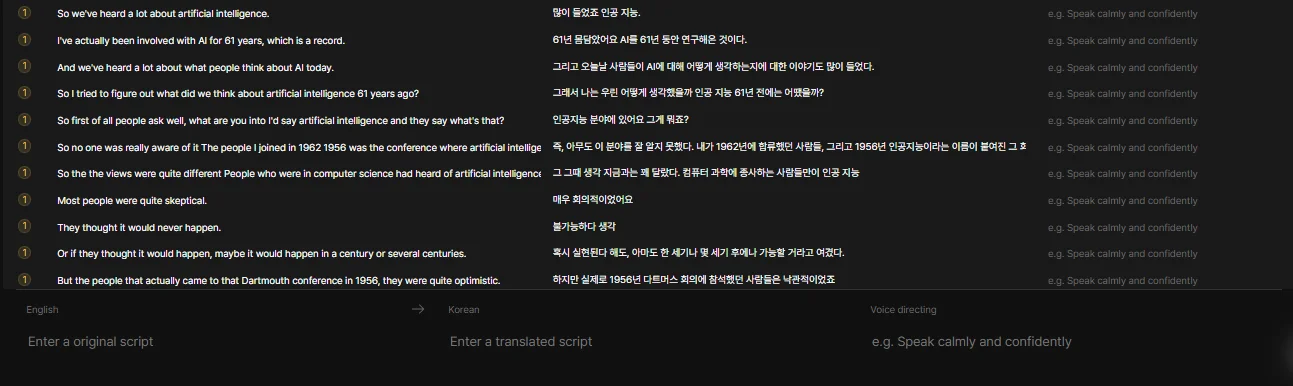 작업 스타일에 따라서 먼저 번역 —> 화자 태깅 —> 보이스 할당 —> 전체 생성 하시는 분도 계시고, 일부분만 별도로 생성하는 케이스도 있습니다.