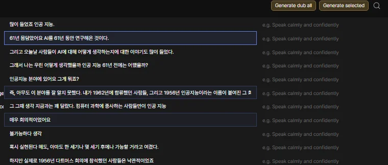 부분 생성을 할 때는 엑셀과 같이 Ctrl을 누른 채로 각 재생성할 대사들을 클릭하면 해당 구간만 선택이 되고 그 상태에서 선택된 대사 생성 버튼을 누르면 됩니다.