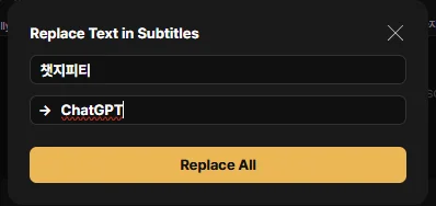 찾아서 바꾸기 : 상단 돋보기 버튼을 클릭하시면 쓸 수 있는 기능입니다. 고유명사나 외래어 등 AI가 이렇게 번역하면 좋겠는 단어들이 있을 때 쓸 수 있는 기능입니다. 검색창에서 원하는 단어와 바꾸고 싶은 단어를 입력하면 전체 대사에서 일괄로 수정이 됩니다.