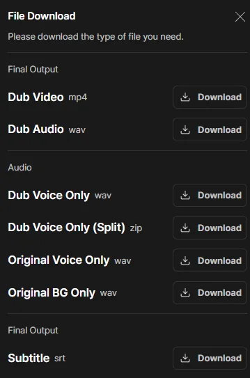 Audio: 더빙된 목소리만 담긴 트랙. (유튜브 다국어 오디오 트랙용으로 추천!)