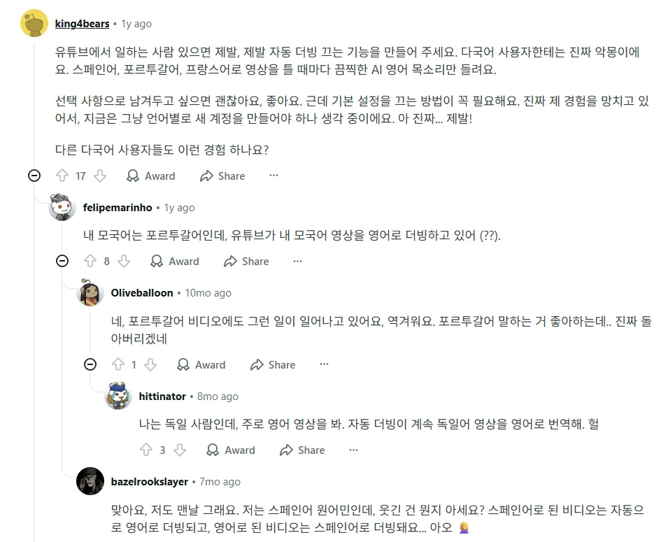 이 자동 더빙 기능, 이론적으로만 보면 전세계인 시청자들의 언어 장벽을 없애주는 그런 파격적인 기술인데 정작 Reddit 등 해외 사이트를 보면 평이 좋지 않아요. 해당 옵션이 디폴트 온이기 때문에 자동으로 적용이 되는데 어떻게 하면 이걸 끌 수 있는지 물어보는 글들이 많이 올라옵니다. 왜 그럴까요?