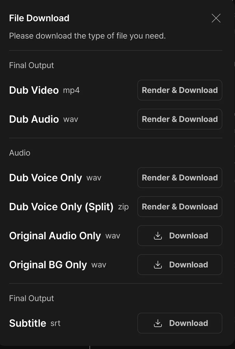 Dub voice only split exports the dubbed voices separated from the background as a ZIP file. Use this when you need the individual elements for professional audio mixing.