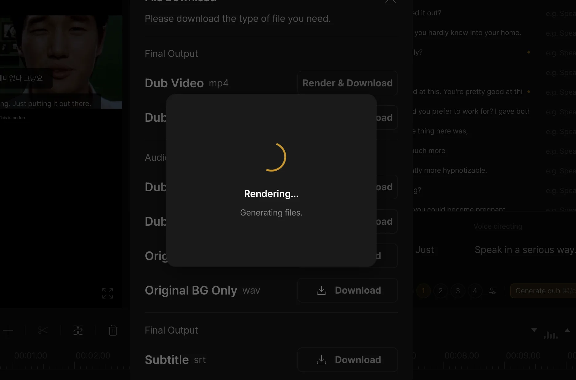 If you are taking the project into a video editor like Premiere Pro, DaVinci Resolve, or Final Cut Pro, download Dub voice only and Original BG only separately. This gives you full control over levels, mixing, and any final audio adjustments before export.