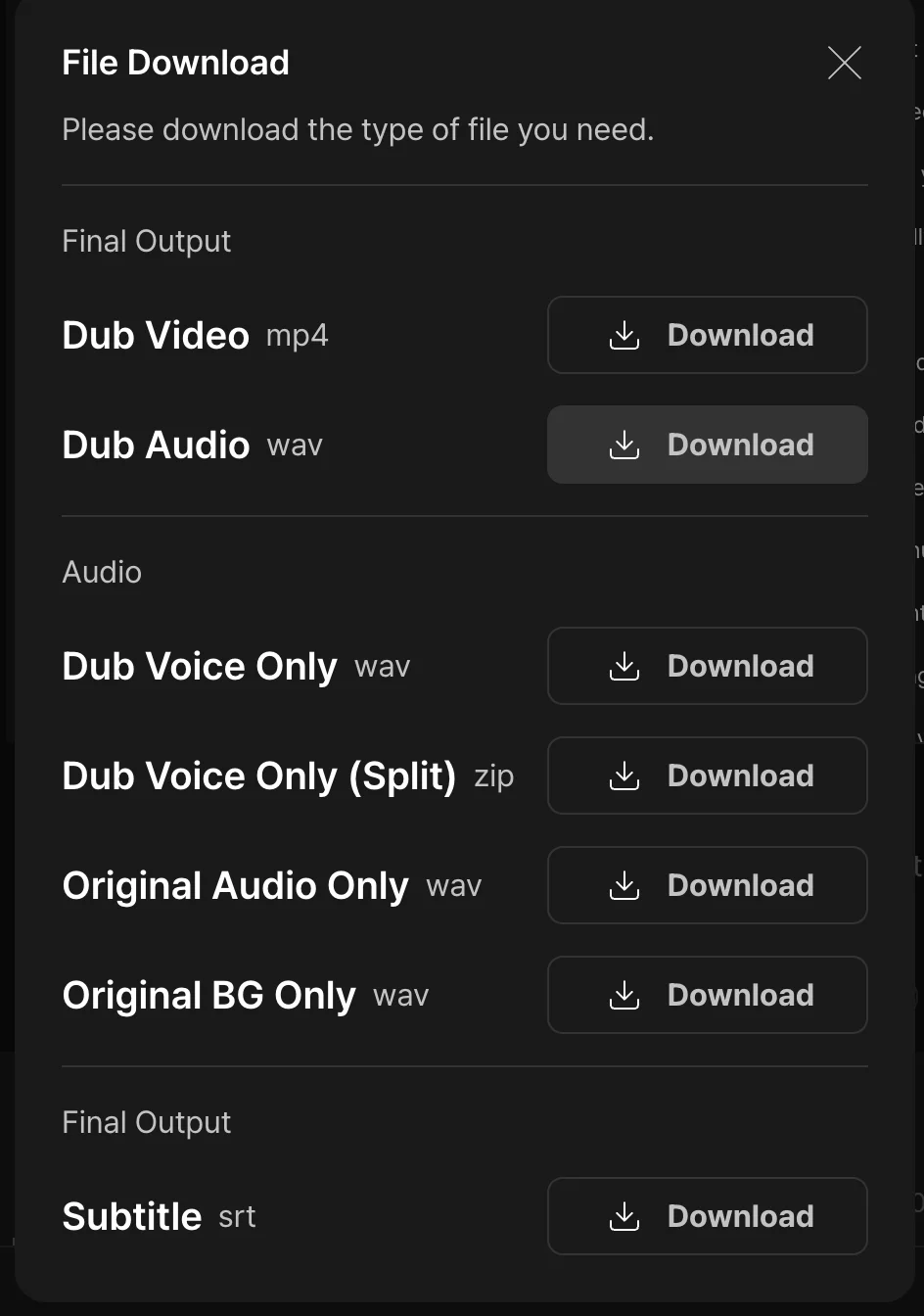 Dub audio is the full dubbed audio track including voices and background. Available as MP4 or WAV. Use this if you want to bring the audio into an external editor or replace the audio track in an existing video file.