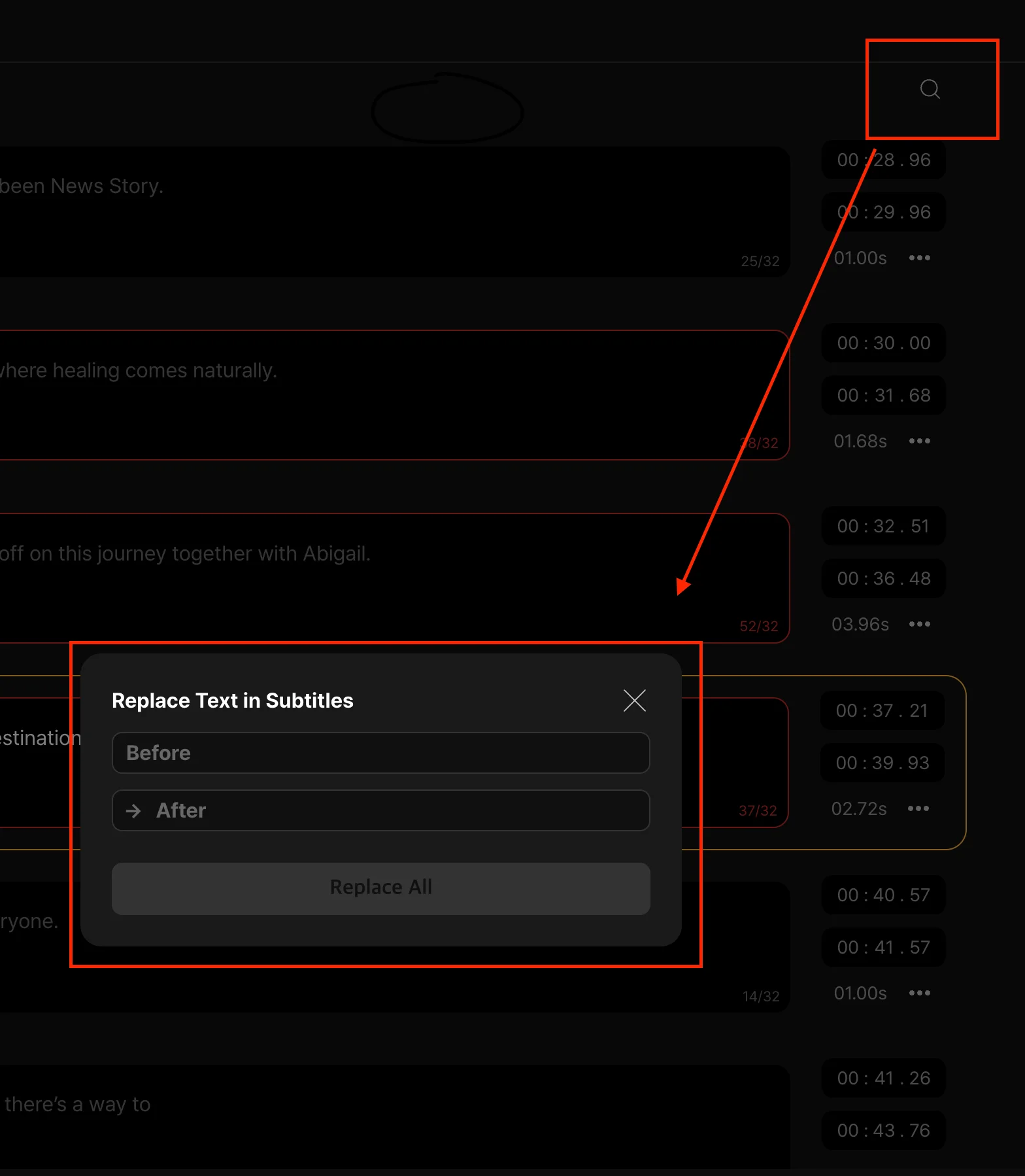 If the same word or phrase is wrong across multiple segments, do not fix them one by one. Click the magnifying glass icon in the top right corner of the work area to open the Replace Text in Subtitles panel. Type the incorrect text in the Before field, type the correct version in the After field, and click Replace All. Every instance across the entire project updates instantly.